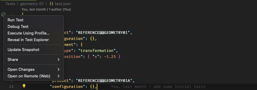 You can execute a single test using the play button in the top left side of the editor when a test.json file is opened. Alternatively you may execute multiple tests through the Testing view in vscode's sidebar.